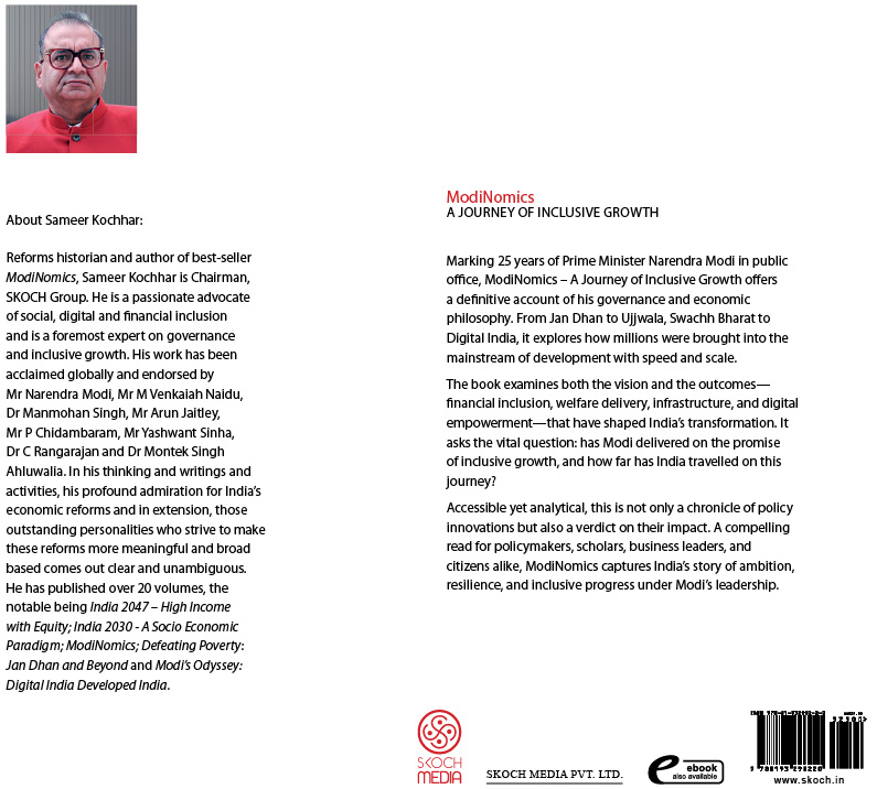 About the Author: Reforms historian and author of best-seller ModiNomics, Sameer Kochhar is Chairman, SKOCH Group. He is a passionate advocate of social, digital and financial inclusion and is a foremost expert on governance and inclusive growth. His work has been acclaimed globally and endorsed by Mr Narendra Modi, Mr M Venkaiah Naidu, Dr Manmohan Singh, Mr Arun Jaitley, Mr P Chidambaram, Mr Yashwant Sinha, Dr C Rangarajan and Dr Montek Singh Ahluwalia. In his thinking and writings and activities, his profound admiration for India's economic reforms and in extension, those outstanding personalities who strive to make these reforms more meaningful and broad based comes out clear and unambiguous. He has published over 20 volumes, the notable being India 2047 — High Income with Equity; India 2030- A Socio Economic Paradigm; ModiNomics; Defeating Poverty: Jan Dhan and Beyond and Modi's Odyssey: Digital India Developed India.