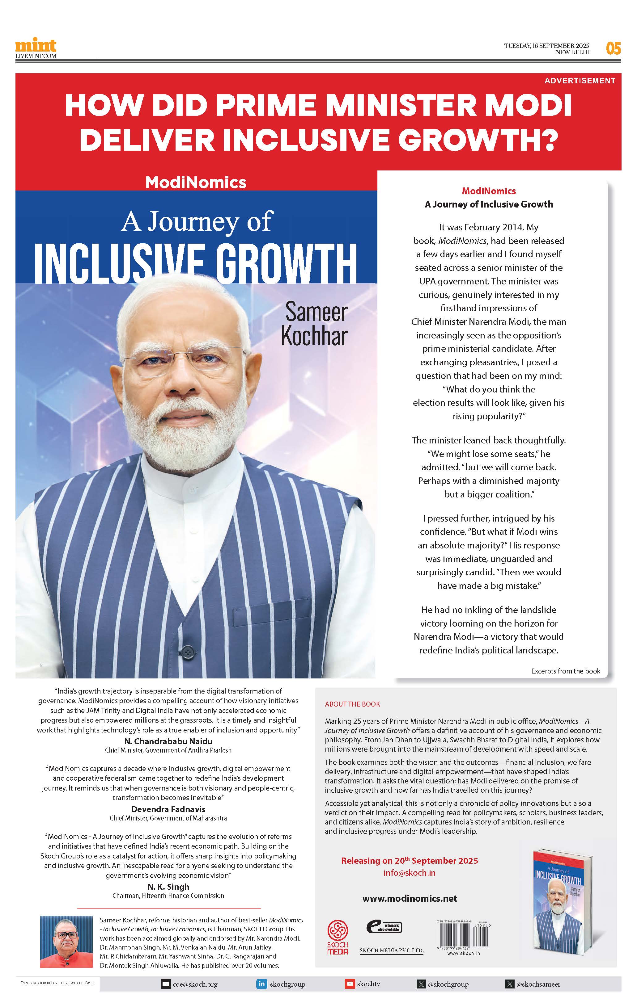Reforms historian and author of best-seller ModiNomics, Sameer Kochhar is Chairman, SKOCH Group. He is a passionate advocate of social, digital and financial inclusion and is a foremost expert on governance and inclusive growth. His work has been acclaimed globally and endorsed by Mr Narendra Modi, Mr M Venkaiah Naidu, Dr Manmohan Singh, Mr Arun Jaitley, Mr P Chidambaram, Mr Yashwant Sinha, Dr C Rangarajan and Dr Montek Singh Ahluwalia. In his thinking and writings and activities, his profound admiration for India's economic reforms and in extension, those outstanding personalities who strive to make these reforms more meaningful and broad based comes out clear and unambiguous. He has published over 20 volumes, the notable being India 2047 — High Income with Equity; India 2030- A Socio Economic Paradigm; ModiNomics; Defeating Poverty: Jan Dhan and Beyond and Modi's Odyssey: Digital India Developed India.