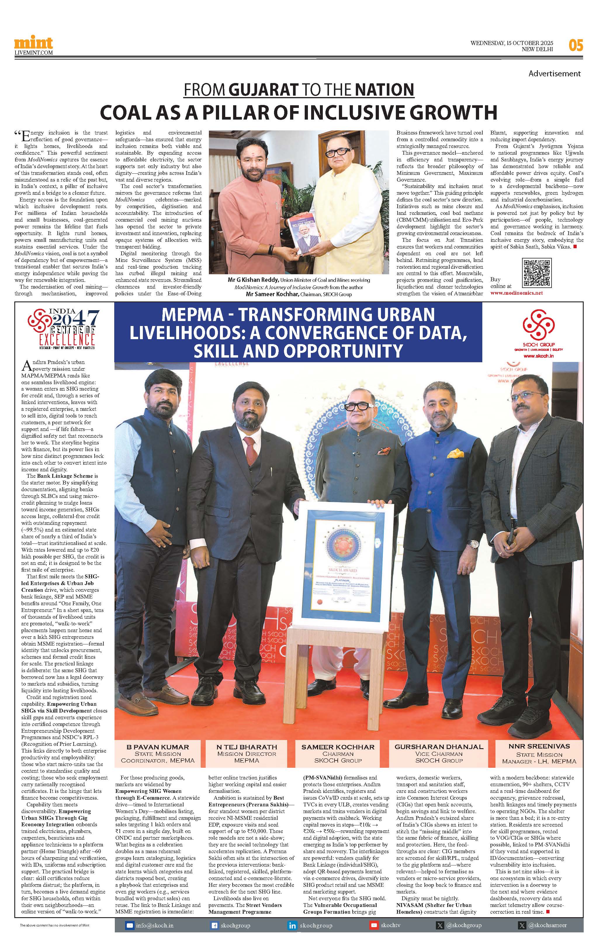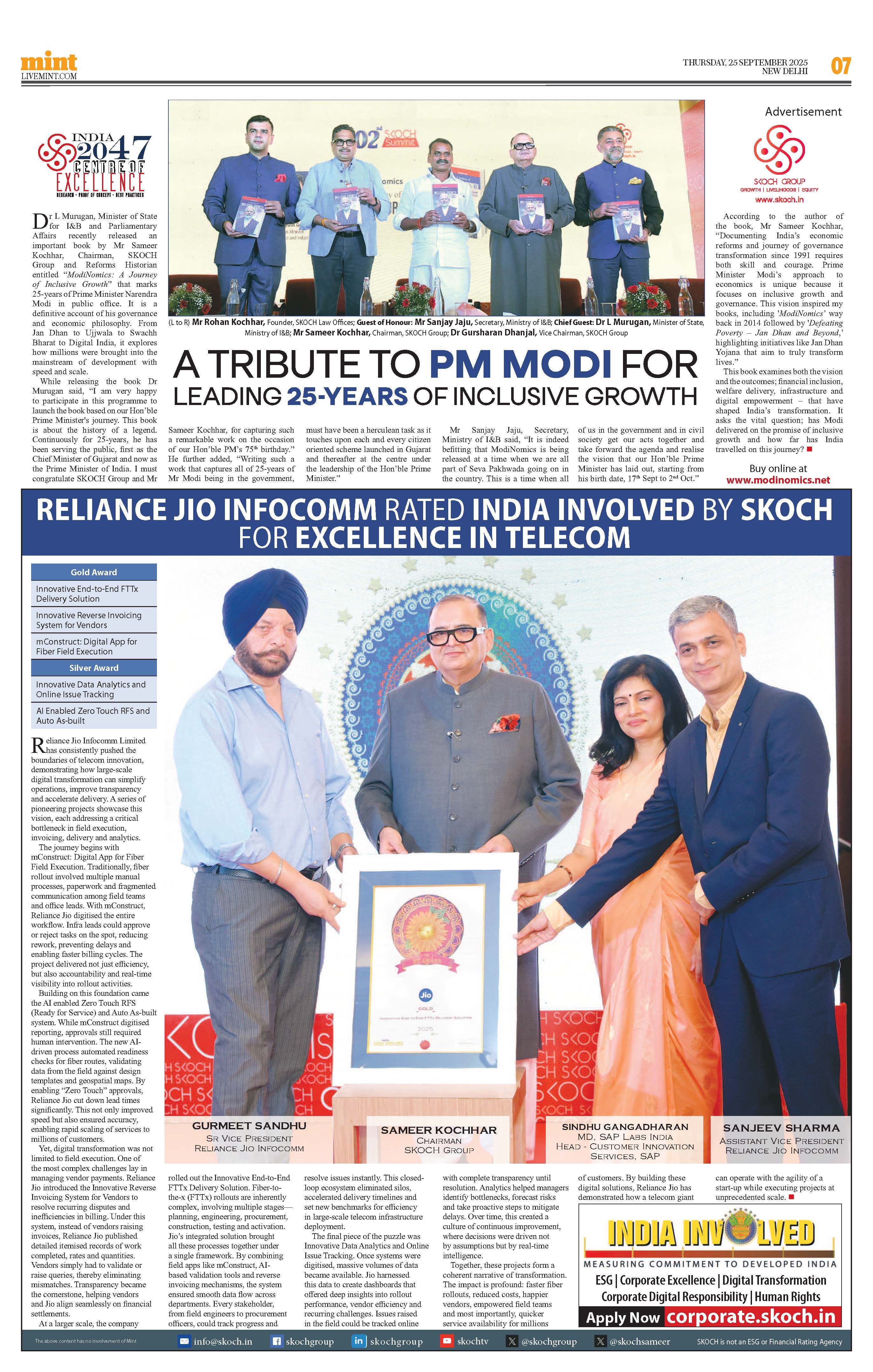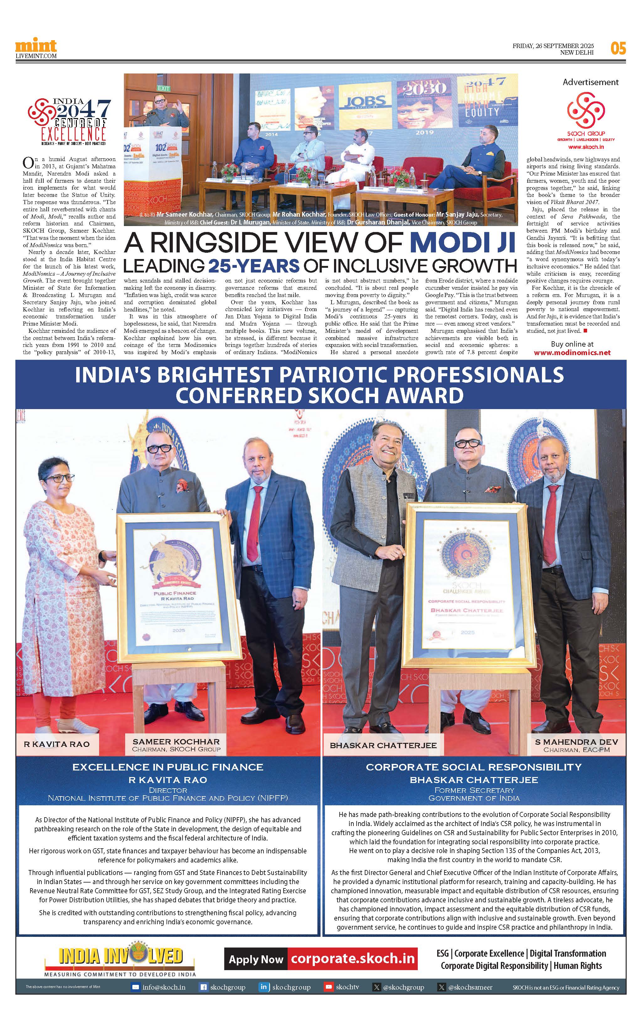 Summary: Mr Sameer Kochhar reflected on his journey as a reforms historian and the evolution of Modinomics, tracing its roots to 2013 when he first coined the term. He highlighted Prime Minister Modi’s focus on combining economic and governance reforms to ensure inclusive growth through initiatives like Jan Dhan, Mudra Yojana, Digital India, and DBT. Kochhar shared his writings documenting this transformation, emphasizing job creation, livelihoods, and improved quality of life as central to Modi’s 25 years in public service. His latest book, Modinomics: Journey of Inclusive Growth, compiles these insights and real-life stories of impact.*